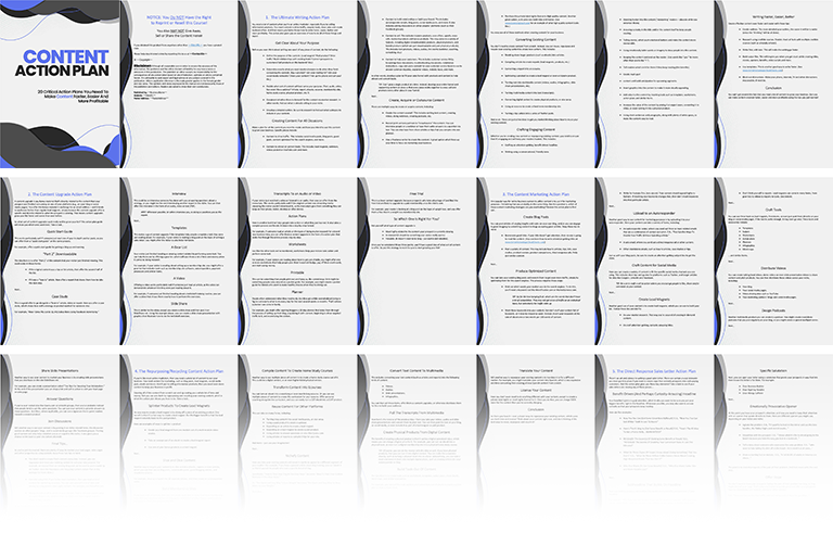 All total, there are over 70 pages of “no fluff” profitable content creation and utilization strategies inside these Content Action Plan guides!